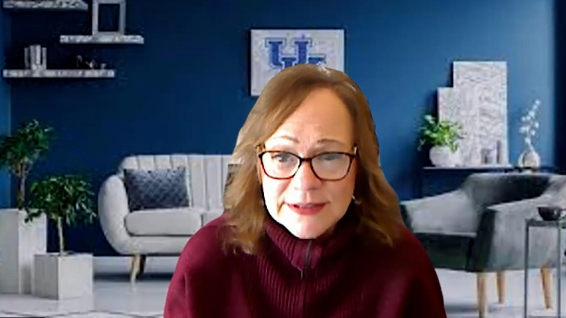 Host Renee Shaw smiling in a green dress with a KET set behind her.